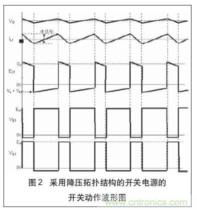 在達到預定的電壓或電流限值時,控制集成電路將開關斷開,從而使電感周圍的磁場衰減,并使偏置二極管D1正向導通,從而繼續向輸出電路供給電流,直至開關再度接通。這一循環反復進行,而開關的次數由控制集成電路來確定,并將輸出電壓調控在要求的電壓值上。圖2所示為在若干個開關循環周期內,流過電感器和其它降壓拓撲電路元件上的電壓和電流波形。