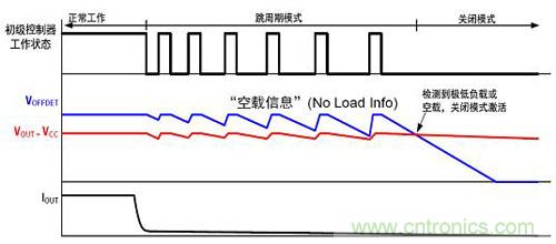 圖1是進入關閉模式的過程。當輸出電流從滿載慢慢降低時,初級控制器會從正常工作轉換成跳周期工作,輸出電壓和空載信息基本上比較接近;當輸入極低跳周期或關閉模式時,輸出空載電壓將低于輸出電壓,從而檢測到極低負載或空載,激活關閉模式。