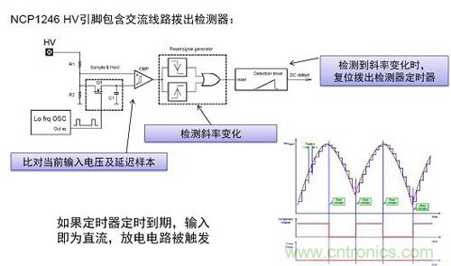 為了符合安規標準,AC-DC電源必須具備在撥出交流插頭后不到1秒時間內將電磁干擾(EMI)濾波器X2輸入電容放電的能力。為了符合此要求,常使用與電容并聯的一串高阻抗電阻,但是,電阻型消耗源 (drain)消耗約25 mW輸入能耗,當考慮到空載輸入能耗時,此25 mW能耗相對較大。安森美半導體的方案采用有源X2電容放電來檢測斷開交流連接狀況,并通過開關觸發電容放電。NCP1246 HV引腳包含了交流線路撥出檢測器,如果定時器定時到期,輸入即為直流,放電電路被觸發,X2電容放電,見圖2。