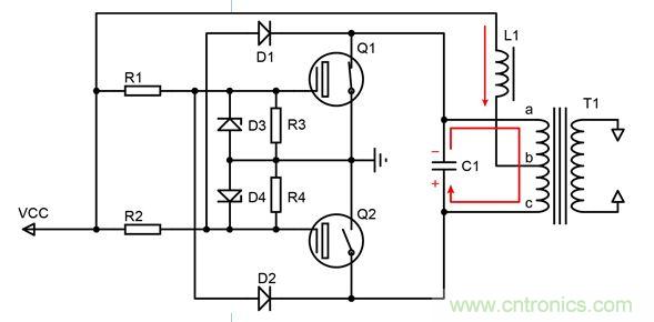 7.      (圖3)由于T1對C1的持續(xù)充電,C1上電壓為a正c負(fù),通過兩個(gè)二極管使Q2柵極電壓升高,Q1柵極逐漸下降,同時(shí)正反饋形成,Q2導(dǎo)通,Q1截止。