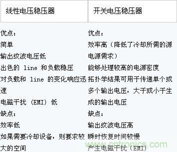 1.線性穩壓器與開關穩壓器的主要優劣勢特點如下表所示: