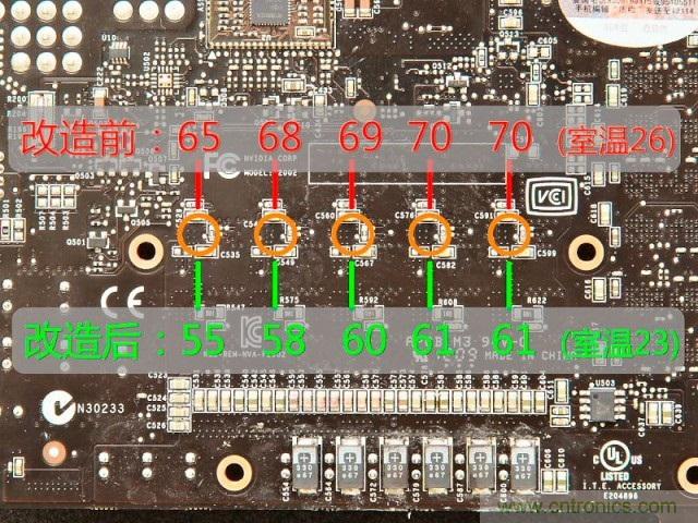 看下改造前后的供電模塊溫度吧,使用紅外測溫槍對準供PCB背面供電模塊的位置分別取5個測量點,測試使用FC2的benchmark tool連續運行25分鐘后進行溫度采集。沒有空調,室溫不固定,沒有辦法,不過還是能看出改造后供電模塊的溫度的確有明顯的下降,刨去室溫的差距后應該還能有5度以上的溫差。另外溫度的下降在另一個方面說明供電模塊的效率提升,只是忙著改造忘記在之前測一下功率了,個人感覺應該能省5瓦左右的功率吧。