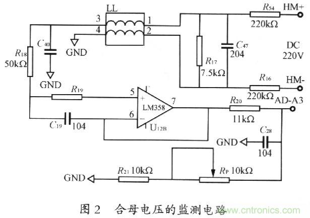 合母電壓監(jiān)測(cè)電路如圖2所示。合母電壓流過電阻R16、R17、R54,在電阻R17上取樣,故而電阻R17應(yīng)選用高精度電阻。R16和R54因?yàn)橐入娮鑂17大得多,又是出現(xiàn)在分母上,故而不必選用高精度電阻。LL的作用是抑制共模干擾。可以通過調(diào)節(jié)電位器Rp的大小來使所要監(jiān)測(cè)電壓的大小符合A/D轉(zhuǎn)換器輸入電壓要求。