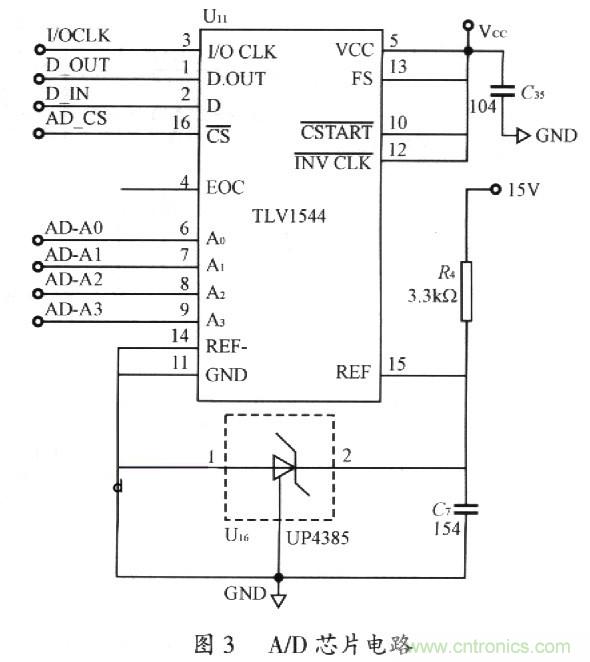 A/D轉(zhuǎn)換芯片采用TLV1544。TLVl544的主要特點(diǎn)是:寬范圍的單電源供電,VCC可為2.7~5.5V;芯片內(nèi)部有著較高的轉(zhuǎn)換速率,轉(zhuǎn)換時(shí)間小于10μs;芯片提供4路外部輸入通道,通過編程給芯片不同的狀態(tài)字設(shè)置可以任意選擇4個(gè)輸入通道之一;芯片有4個(gè)端口作為同步串行接口,通過SPI總線的形式與微處理器連接;11位A/D轉(zhuǎn)換,足以滿足系統(tǒng)的要求。如圖3所示。