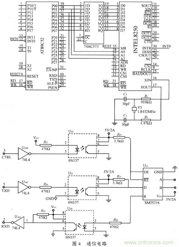 整個(gè)系統(tǒng)內(nèi)部通過RS485進(jìn)行通信。具體電路如圖4所示。因?yàn)榭刂菩酒疾捎肁T89C52,作為主監(jiān)控單元CPU只有一個(gè)串口,而其并口也沒有充分利用起來,故通過可編程串行接口芯片8250擴(kuò)展串口,用并口來模擬串口。