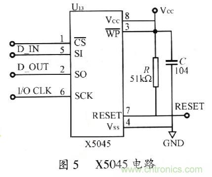 X5045電路的設(shè)計(jì)如圖5所示。本器件將四種功能合于一體:上電復(fù)位控制、看門狗定時(shí)器、降壓管理以及具有塊保護(hù)功能的串行EEPROM。它有助于簡(jiǎn)化應(yīng)用系統(tǒng)的設(shè)計(jì),減少印制板的占用面積,提高可靠性。將其與CPC以SPI總線方式連接,讀寫簡(jiǎn)單,其內(nèi)部的EEPROM還可以保護(hù)一些重要數(shù)據(jù)。
