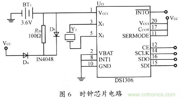采用功能齊全的時(shí)鐘芯片DS1306。DS1306的時(shí)間、日歷和報(bào)警器可以通過寫相應(yīng)的寄存器位來設(shè)置和初始化。通過讀相應(yīng)寄存器就可獲得日歷和時(shí)間。DSl306的電源供給有三種運(yùn)行方式,本系統(tǒng)采用可充電電池的方式,如圖6所示。