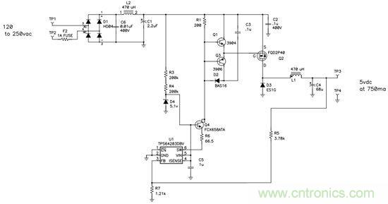 PMP5412 — 120VAC-250VAC 輸入、5V/0.75A 無(wú)變壓器偏置電源