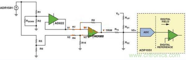 圖5中的電路具有兼容模擬向上或者向下調壓的功能兩個電阻分壓器產生兩個基準電壓,其中一個基準電壓表示模擬控制器所需的輸出基準電壓,另一個表示內部基準電壓。利用一個電壓跟隨器來避免所需的輸出基準電壓與后續電路相互影響。利用AD822 FET輸入運算放大器,將所需的輸出基準電壓(V1)從模擬控制器的內部基準電壓(V2)中去除,得到所需的電壓差。此電路的線性放大增益確保了VTRIM足夠大,從而能對VVS+產生影響。