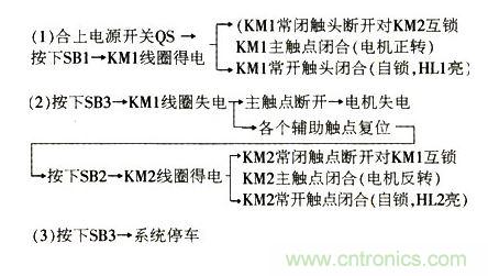 2) 檢查自鎖環節。用萬用表 R × 10 擋或 R × 100 擋,將兩表筆分別接在圖中 2 、 5 兩點,正常情況萬用表指針此時應指在“∞”位置。萬用表指針指示正常后,手動交流接觸器 KM1 ,若萬用表指針向右偏轉,說明自鎖輔助動合觸點 KM1 接線正確且動作良好.萬用表指示的電阻值為交流接觸器線圈的直流電阻。然后,松開交 流接觸器 KM1 .使萬用表指針回到“∞”位置。再手動交流接觸器 KM2 ,若萬用表指針向右偏轉,說明自鎖輔助動合觸點 KM2 接線正確且動作良好。