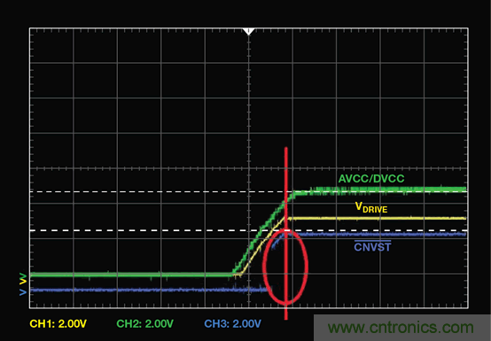 在所有電源均完全建立之前,不得切換數(shù)字引腳。對于SAR ADC,轉(zhuǎn)換開始引腳CNVST 可能對噪聲敏感。在圖1 所示示例中,當(dāng)AVCC、DVCC 和VDRIVE 仍在上升時(shí),主機(jī)cPLD 拉高CNVST。這可能使 AD7367 進(jìn)入未知狀態(tài),因此,在電源完全建立之前,主機(jī)應(yīng)使 CNVST 保持低電平。