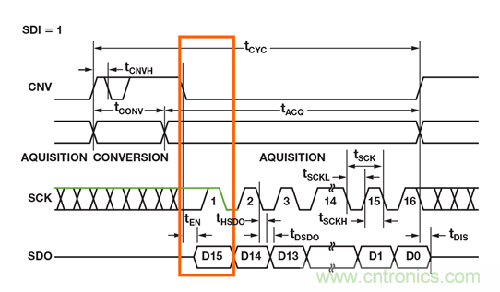 ADI 公司帶SPI 接口的許多SAR ADC 都是從 CS 或CNV 的下降沿為MSB 提供時(shí)鐘信號,剩余的數(shù)據(jù)位則跟隨SCLK 的下降沿,如圖3 所示。在讀取MSB 數(shù)據(jù)時(shí),要使用等式中的tEN 而非tDRV。