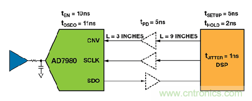 在圖4 中,DSP 主機(jī)訪問 AD7980 處于3 線 CS 模式下,其中,VIO = 3.3 V。DSP 鎖存SCLK 下降沿上的SDO 信號。DSP 的額定最小建立時(shí)間為5 ns,最小保持時(shí)間為2 ns。對于典型的FR-4PCB 板,傳播延遲約為180 ps/in。緩沖器的傳播延遲為5 ns。CNV、SCLK 和SDO 的總傳播延遲為