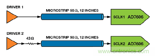 在圖7 中,一個(gè)驅(qū)動(dòng)器通過一條12 英寸的微帶線路連接SCLK1,另一個(gè)驅(qū)動(dòng)器通過一個(gè)與微帶串聯(lián)的43 Ω 電阻連接SCLK2。