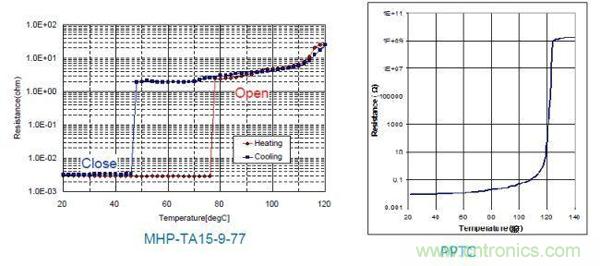 因此,不論哪種方式的快速充電,都是通過提高充電電流或功率來加速鋰電池芯內部的反應來實現的,必須通過更多的保護來防止由于電池芯的熱失控而引起的起火甚至爆炸。TE的PPTC和MHP-TA 可以有效地提供這種保護,MHP-TA是結合了雙金屬片和PPTC的溫度/電流保護器件,溫度保護更加精確,可以適用于電流較大、溫度保護要求更高的電子設備,如:智能手機、平板電腦、超級本、筆記本電腦等。MHP-TA及PPTC的特性及應用如下圖,緊貼電池芯的設計可以使MHP-TA和PPTC更好的感測電池溫度,當電池溫度異常升高時可以呈現高阻,阻礙電池的充放電電流,確保電池的安全使用。