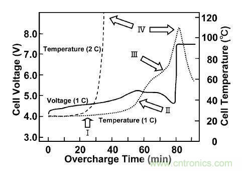 下圖是鋰離子電池過充電測試的一個事例??梢钥闯龀潆娺^程中鋰離子電池芯內部溫度和電壓的變化情況,正常1C充電時,電池芯的溫度隨恒流充電慢慢升高,而隨恒壓階段電流減小慢慢降低,整個過程溫度可控,安全。當大電流(2C或以上)時,電池芯內部反應劇烈發生熱失控,溫度急劇升高而發生起火或爆炸。