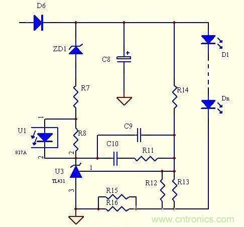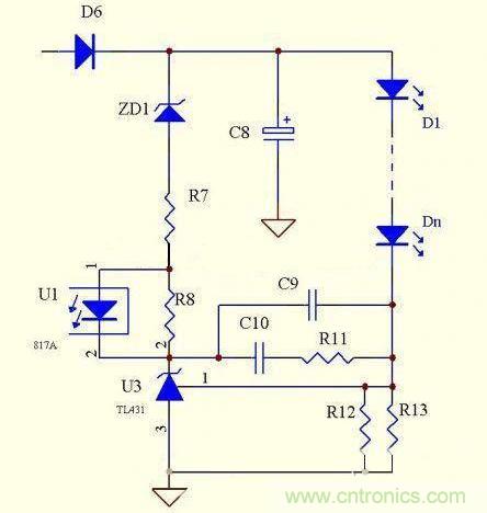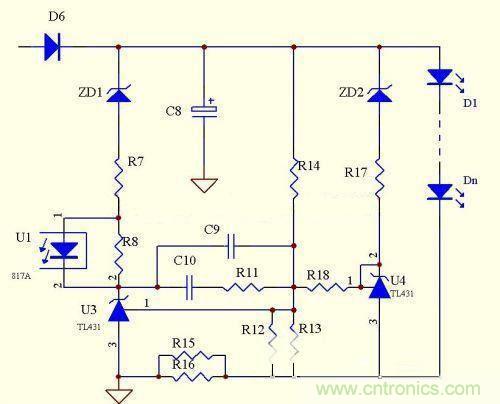 優點:電路簡單,元器件少,成本低,跟上面電路相比,顯著降低了取樣電阻的功耗,恒流精度很高,克服了上面的電路不能空載的致命缺陷,當有個別LED擊穿時,可以自動調整輸出電壓。