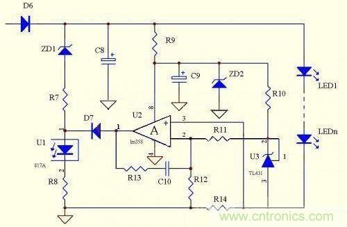 此電路的優點是電路相對比較簡單,恒流精度極高,不受溫度影響,成本較低,是目前大部分廠家使用的經典電路,你把它看成一個反向比例運算放大器就明白妙處了。其實LED電源的次級恒流的變化是比較多的,在這里我們為大家列舉的電路也許并不完全,只是挑選了一些比較經典的電路來進行分析,所以可能會有一些紕漏,歡迎大家及時進行補充。