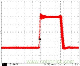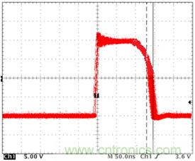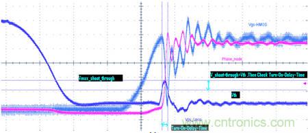 測(cè)試的目的是看上MOS管導(dǎo)通時(shí),有沒有同時(shí)把下管打開,從而導(dǎo)致電源直接導(dǎo)通到地而引起短路。如圖三所示藍(lán)色曲線(Vgs_Lmos)就是下管在上管導(dǎo)通的同時(shí),被帶了起來,如果藍(lán)色曲線的被帶起來的尖峰超過了MOS管的Vth要求,同時(shí)持續(xù)時(shí)間(Duration)也超過了datasheet要求,從而就會(huì)有同時(shí)導(dǎo)通的風(fēng)險(xiǎn)。當(dāng)然,這是大家最常見到的情況。