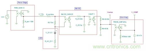 圖2是仿真控制回路的圖1的簡單SPICE模型。VC1是COMP引腳上的電壓,直接驅動跨導增益為13的功率級(控制器更多的內部細節請參見TPS54218數據表內的圖31)。這個電流通過電感器和感測電阻器來直接驅動LED。需要注意的是,電感值和LED值的變化不會對響應產生影響,這是因為電感器中的電流受到了控制。