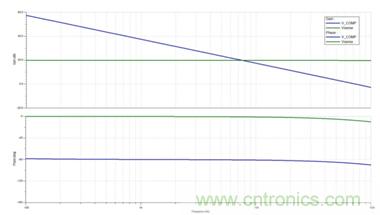 外部補償組件C6從這個點 (V_COMP) 上接地。需要注意的是,V_COMP也是我們回路仿真的起始點 (VC1)?;芈吩鲆媸荲_COMP引腳上測得的電壓除以VC1上的注入擾動。所以,通過將VC1設定為1 Vac信號,回路增益最終就是V_COMP上測得的電壓。