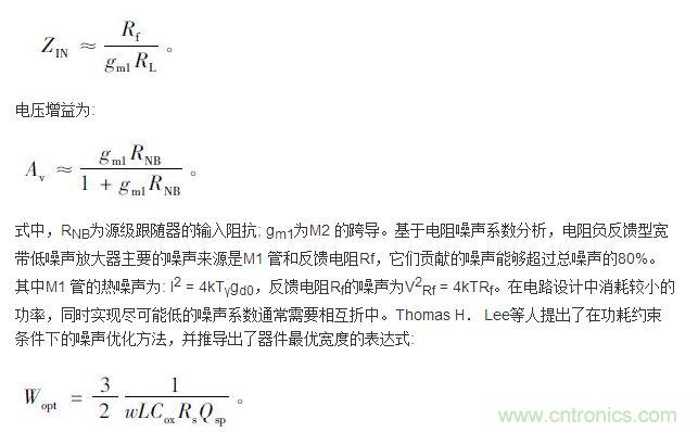 ③ M1 的溝道熱噪聲被反饋電路降低,在寬頻帶范圍內(nèi)實(shí)現(xiàn)噪聲系數(shù)NF<3. 6 dB。通過分析小信號模型和噪聲系數(shù),得到該結(jié)構(gòu)的輸入阻抗為:
