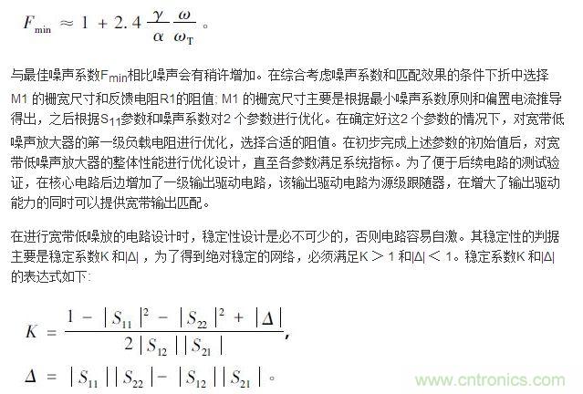 【導(dǎo)讀】本文給出了一種1 ~ 3 GHz 頻段的寬帶低噪聲放大器的設(shè)計(jì),電路采用電阻負(fù)反饋結(jié)構(gòu),采用SMIC 0.18 μm RF CMOS 工藝對寬帶低噪聲放大器進(jìn)行了優(yōu)化分析和仿真,結(jié)果表明在寬帶匹配、通道增益及噪聲系數(shù)方面都取得了較好的性能,對于寬帶低噪聲放大器的設(shè)計(jì)具有一定的參考價(jià)值。