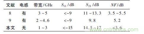 本文設(shè)計(jì)的寬帶低噪聲放大器與已經(jīng)發(fā)表文獻(xiàn)中的寬帶低噪聲放大器的性能比較如表1 所示,這些文獻(xiàn)均采用0. 18 μm 工藝進(jìn)行設(shè)計(jì),具有一定的比較意義。通過表1 可以看出,本設(shè)計(jì)中各項(xiàng)參數(shù)都達(dá)到了較好的性能指標(biāo),避免了傳統(tǒng)集成電路設(shè)計(jì)中需要采用電感的缺點(diǎn),而電感通常在電路設(shè)計(jì)中占用非常大的面積,本文設(shè)計(jì)的寬帶低噪聲放大器省略了傳統(tǒng)低噪聲放大器設(shè)計(jì)中的電感,這將在很大程度上減少芯片的面積; 更為重要的是該芯片依靠自身的MOS 管和比例電阻實(shí)現(xiàn)了內(nèi)匹配,避免了大批量應(yīng)用時(shí)由于芯片內(nèi)部參數(shù)受工藝參數(shù)影響而造成的外圍匹配電路的更改,簡化了芯片的應(yīng)用,在實(shí)際的工程應(yīng)用中具有重要的意義。