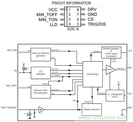 NCP4305可采用SOIC-8、DFN8和WDFN8三種封裝。MIN_TOFF 和MIN_TON引腳通過連接電阻到地,調節最小關斷和最小導通時間。LLD引腳用于在輕載時調節驅動器鉗位電平,或關斷驅動器。DRV引腳是同步整流MOSFET的驅動器輸出。CS(電流采樣檢測)引腳用于檢測電流是否流過同步整流MOSFET。TRIG/DIS引腳提供超快關斷輸入,用作在CCM應用中關斷同步整流MOSFET以提升能效,當上拉超過100 us時激活禁用模式。
