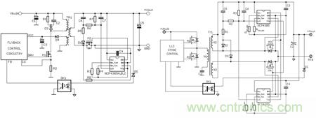 圖2. NCP4305 Flyback或QR應用原理圖(左)和LLC應用原理圖(右)