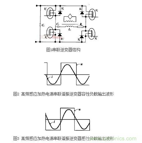 作為高頻感應(yīng)加熱電源設(shè)備的重要組成部分,串聯(lián)諧振逆變器在工作中具有損耗低、工作適應(yīng)性良好等優(yōu)勢。這種逆變器在實際應(yīng)用中也被稱為電壓型逆變器,其基礎(chǔ)結(jié)構(gòu)的原理圖如圖1所示。在實際工作的過程中,串聯(lián)諧振型逆變器的輸出電壓為近似方波。由于電路工作在諧振頻率附近,使振蕩電路對于基波具有最小阻抗,所以負載電流ia近似正弦波。同時,為避免逆變器上、下橋臂間的直通,換流必須遵循先關(guān)斷后導通的原則,在關(guān)斷與導通間必須留有足夠的死區(qū)時間。下圖中的圖2和圖3分別示出容性負載和感性負載的輸出波形。