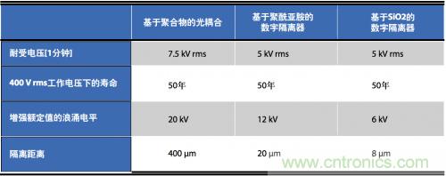 安全標準通常規定1分鐘耐壓額定值(典型值2.5 kV rms至5 kV rms)和工作電壓(典型值125 V rms至400 V rms)。某些標準也會規定更短的持續時間、電壓浪涌(如10 kV峰值并持續50 µs)作為增強絕緣認證的一部分要求。聚合物/聚酰亞胺隔離器可提供最好的隔離特性(見表1)。聚酰亞胺數字隔離器與光耦合器類似,在典型工作電壓下,工作壽命超過電機,額定使用壽命為50年。SiO2隔離器的工作壽命與之接近,但是,對高能浪涌的保護能力卻較弱。