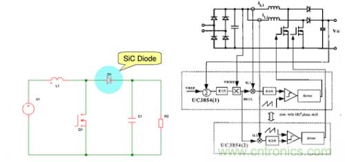 開關(guān)PFC。在這么多拓?fù)渲校薙iC硬開關(guān)PFC以外,其他幾種控制方式都十分復(fù)雜,因此在新一代的主流設(shè)計中工程師們對SiC的硬開關(guān)PFC更感興趣。由SiC器件組成硬開關(guān)電路如下圖2所示: