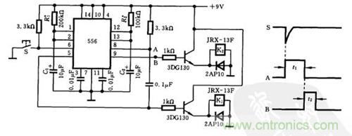 A 脈沖結束時產生的負跳變又觸發第二級定時器,產生延時脈沖B,驅動繼電器K2 ,B 的延遲時間 t2= ~ 1.1R2xC2