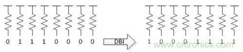 所以,一個(gè)降低DDR4系統(tǒng)功耗的方法是,盡量加大DDR4輸出高的數(shù)量。這個(gè)就是為什么DDR4中多了“DBI管腳”。舉個(gè)例子,當(dāng)8bit lane中有至少有5個(gè)DQ都是低時(shí),所有的Bit將會(huì)被翻轉(zhuǎn),并且DBI(Data Bus Inversion)置低,用來(lái)指示數(shù)據(jù)線的反轉(zhuǎn)。通過(guò)這個(gè)方法,總共9個(gè)信號(hào)中(8個(gè)DQ和1個(gè)DBI),總有至少5個(gè)是被驅(qū)動(dòng)為高電平。如果原始的數(shù)據(jù)中有4個(gè)或者更多的信號(hào)被驅(qū)動(dòng)為高時(shí),那么DBI信號(hào)也將會(huì)設(shè)為高,同樣,還是9個(gè)里面至少有5個(gè)為高。這樣的話,在每一個(gè)數(shù)據(jù)傳輸?shù)倪^(guò)程中,都是至少有5/9的數(shù)據(jù)是高電平,可以在一定程度上降低了功耗。