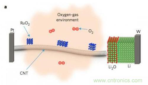 環境透射電子顯微鏡能夠在氧氣環境下進行工作,從而使得在原子級別對鋰氧電池的反應過程進行直接的觀測成為可能。實驗中Langli Luo利用載有納米RuO2催化劑的CNT作為正極,金屬Li作為負極,金屬Li表層的Li2O作為固體電解質,電池結構如下圖所示。