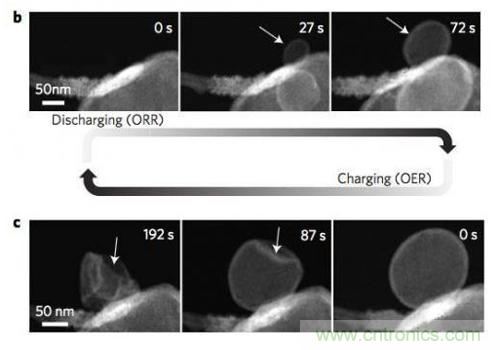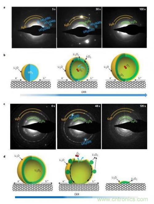 研究顯示,初始反應產物LiO2很快會發生歧化反應生成Li2O2和O2,在顆粒內部釋放的O2被封鎖在了顆粒的內部,從而導致了顆粒成為中空結構,如下圖所示。從SAED的分析結果來看,在開始的幾秒鐘時間內,反應產物中只有LiO2,30秒之后,Li2O2和LiO2開始共存,大約100s后LiO2的衍射峰消失,反應產物只剩下Li2O2和Li2O,TEM分析結果顯示中空球的外側為Li2O,內側為Li2O2。充電過程則正好相反,開始的時候觀察到了Li2O和Li2O2的衍射峰,在48s時出現了LiO2的衍射峰,但是在120s時并沒有再出現LiO2的衍射峰,說明LiO2只是Li2O2分解的一個中間產物。整個過程為我們揭示了Li-O2電池的充放電反應途徑,在放電的時候,Li+通過電解液擴散到CNT表面,在三相界面發生反應,生成LiO2,然后LiO2發生歧化反應(LiO2?Li2O2+O2),生成Li2O2和O2,反應釋放的O2會將反應產物從最初的10nm左右,吹到100nm左右,而在產物的表面由于有豐富的Li+,因此會與O2反應生成Li2O。在充電的過程中,Li2O2首先會失去一個Li+和一個電子,形成LiO2,隨后LiO2發生分解,產生Li2O2和O2,然后Li2O2再次失去Li+和電子,如此循環指導所有的Li2O2消耗完畢。