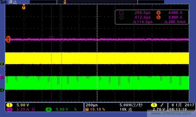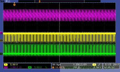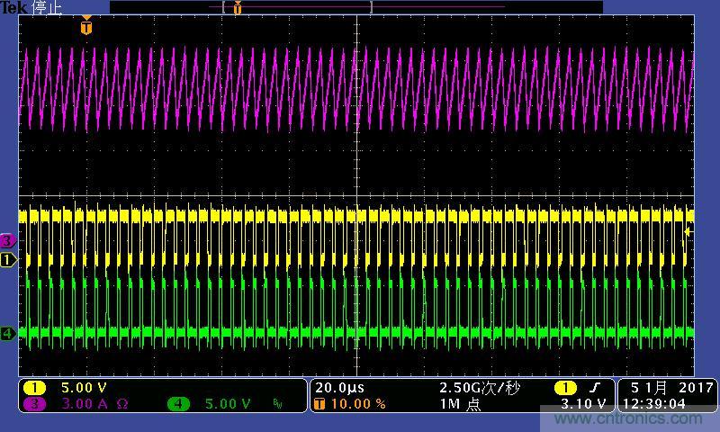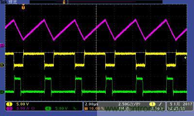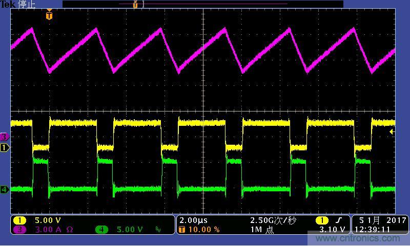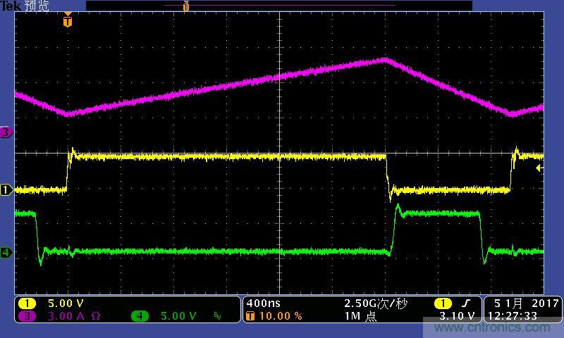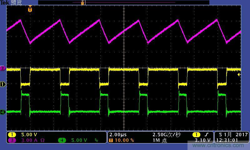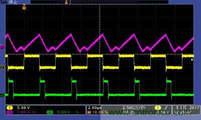 注:功率電感電流波形及高低端MOS管驅(qū)動(dòng)波形。其中:①黃色:高端驅(qū)動(dòng)波形;④綠色:低端驅(qū)動(dòng)波形;③紫色:電感電流