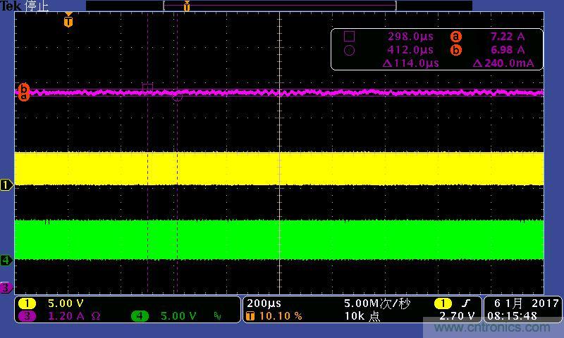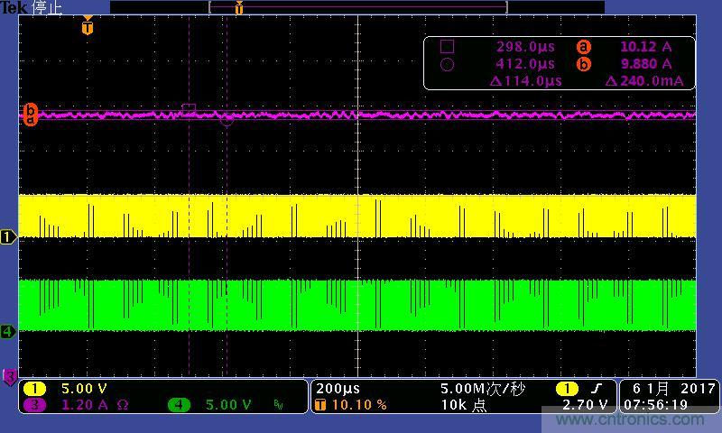 注:4A/7A/10A時(shí)的輸出電流波形。其中:①黃色:高端驅(qū)動(dòng)波形;④綠色:低端驅(qū)動(dòng)波形;③紫色:輸出電流