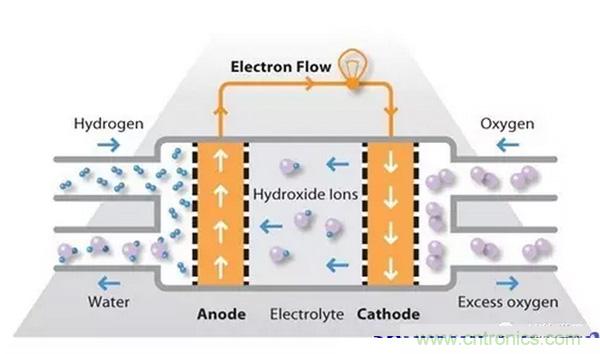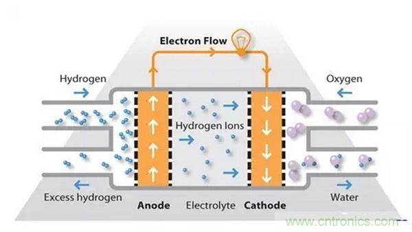氫燃料在陽極處被處理,其中電子與鉑基催化劑的表面上的質(zhì)子分離。質(zhì)子通過膜到達(dá)電池的陰極側(cè),同時(shí)電子在外部電路中行進(jìn),產(chǎn)生電池的電輸出。在陰極側(cè),另一個(gè)貴金屬電極將質(zhì)子和電子與氧氣結(jié)合以產(chǎn)生水,其作為唯一的廢物排出;氧可以以純化形式提供,或者在電極處直接從空氣中提取。