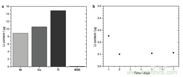 圖3. (a)鎳、銅、鈦、硼摻雜金剛石四種物質和金屬鋰作用后的質量變化柱形圖,(b)硼摻雜金剛石中鋰的時間-質量變化曲線。
