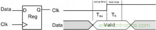 建立時間(Setup Time)常用Tsu表示,指的是在觸發器的時鐘信號上升沿到來以前,數據和使能信號穩定不變的時間,如果建立時間不夠,數據將不能在這個時鐘上升沿被打入觸發器,使能信號無效,也就是說在這個時鐘周期對數據的操作時無效的;保持時間(Hold Time)常用Th表示,指的是在觸發器的時鐘信號上升沿到來以后,數據和使能信號穩定不變的時間,如果保持時間不夠,數據同樣不能被打入觸發器,對數據的操作同樣是無效的,使能信號無效。數據要能穩定傳輸,就必須滿足建立時間和保持時間的關系,圖 4標識了它們間的關系。