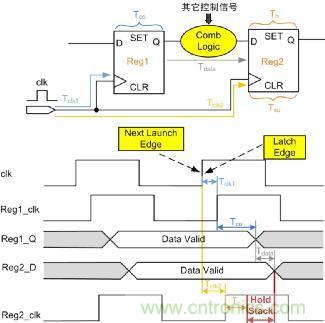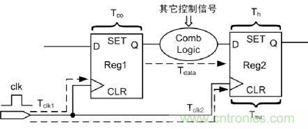 如圖 6所示,為分析建立時間/保持時間的基本電路圖。Tclk1為Reg1的時鐘延時,Tclk2為Reg2的時鐘延時,Tco為Reg1固有延時,Tdata為Reg1的到Reg2之間組合邏輯的延時,Tsu為Reg2的建立時間,Th為Reg2的保持時間,設時鐘clk周期為T,這里分析數據的建立時間和保持時間。