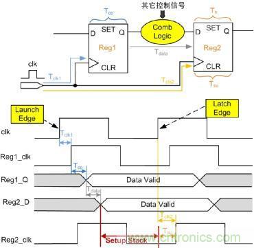 如果建立時間的裕量Setup Stack小于0,則不滿足建立時間,也就會產生不穩定態,并通過寄存器傳輸下去。