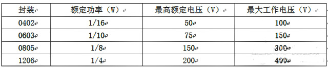 先來看看某廠家四種常用封裝電阻的參數(shù)表。其中表中有兩個值:額定工作電壓和最大工作電壓。