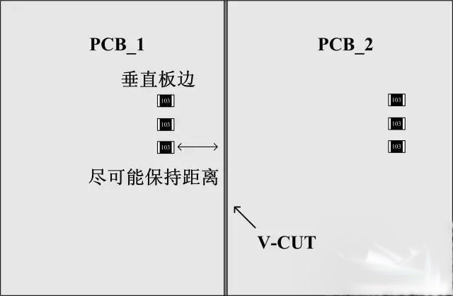 貼片電阻的另外一種常見的損壞是機械損傷后呈開路狀態(tài),后續(xù)導(dǎo)致電路異常(器件外觀有可能正常)。下面是幾個小建議:1、如果是手折板的話(極少使用,無法機器分析,毛刺大),貼片電阻長度方向平行于PCB板邊,零件受的應(yīng)力小;如果是V-CUT的話,貼片器件長度方向垂直于PCB邊,零件破裂可能性較小。2、元件如果與連接處垂直,到連接處的距離建議要≥4mm,若平行,距離建議要≥1.5mm.3、在成本允許的情況下,適當加厚PCB板厚度,特別是面積比較大的板子。(下面是兩個簡單的示意圖,實際情況請實際分。)