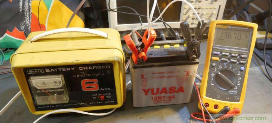 充電器在摩托車電池上施加了合適的13.67V電壓(圖8)。我在福特工作時(shí)設(shè)計(jì)過充電系統(tǒng),我知道充電范圍是13.5到14.2伏。我喜歡讓它置于低電壓,這樣就不會(huì)弄壞這些小電池啦。