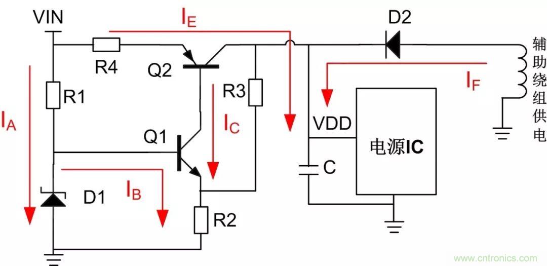 輸入電壓VIN為NPN三極管Q1提供IB電流使用它處于放大區,IC為放大電流也為PNP三極管Q2的基極電流,通過對IC電流的控制,可使Q2處于飽和狀態并以IE的飽和電流向電容C充電,直到Q2處于半截止或半飽和狀態。此時,電容就等效成一個恒流源為IC芯片提供能量,當電容電壓降到一定值時,啟動電路繼續為電容充電,直到輔助供電有電壓后,才通過電阻R2、R3之間的分壓使Q1處于截止狀態,此時啟動電路才停止工作,之后芯片的供電完全由輔助繞組提供。