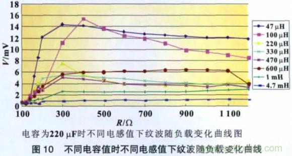 圖10 所示為在不同電容值(貼片鉭電解)下,改變電感和負載并測量負載上的電源紋波有效值所得出的曲線圖。