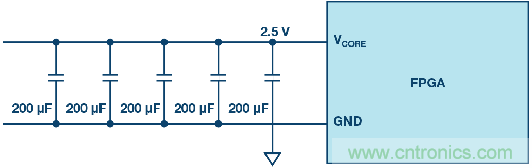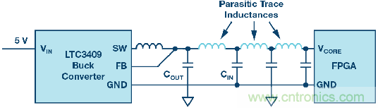 圖7. 電源輸出電容與FPGA輸入電容之間的寄生去耦。
